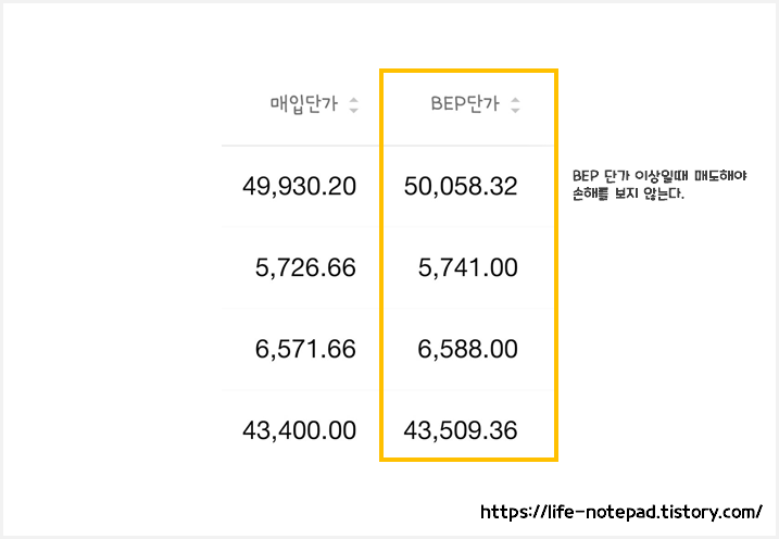 손익분기점 BEP는 수수료까지 포함하여 얼마에 매도를 해야 나에게 이익이 생기는지 알려준다.