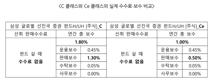 - Ce 클래스: 선취 수수료 없음. 판매보수는 일반 클래스에 비해 20~50% 저렴