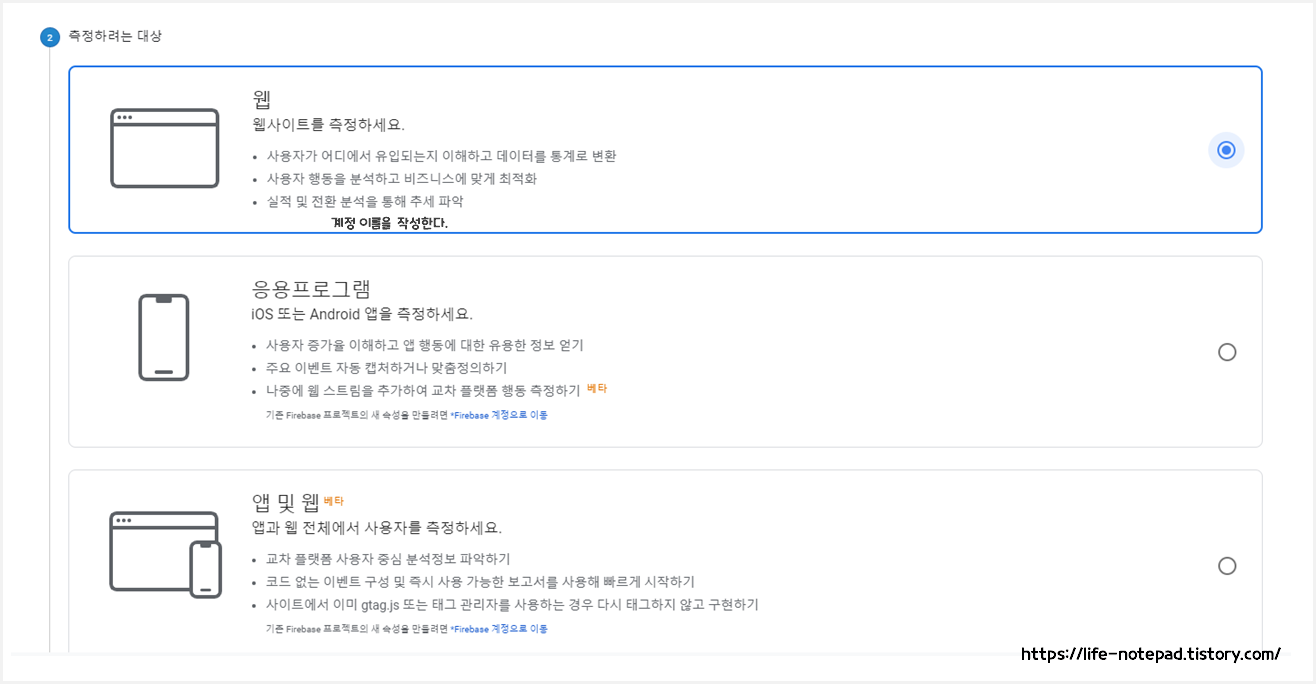 - 웹, 모바일인 경우 3번째 `앱 및 웹` 을 체크한다.
