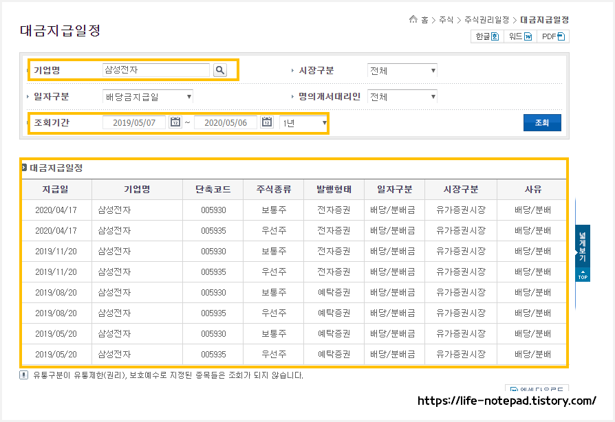 주식 -> 주식 권리일정 -> 대금지급일정 -> 조회 (내가 가진 주식)