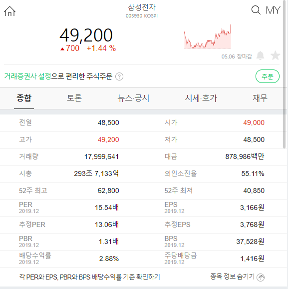 삼성 전자의 경우, 배당수익률이 2.88%이다. (2020/05 기준)