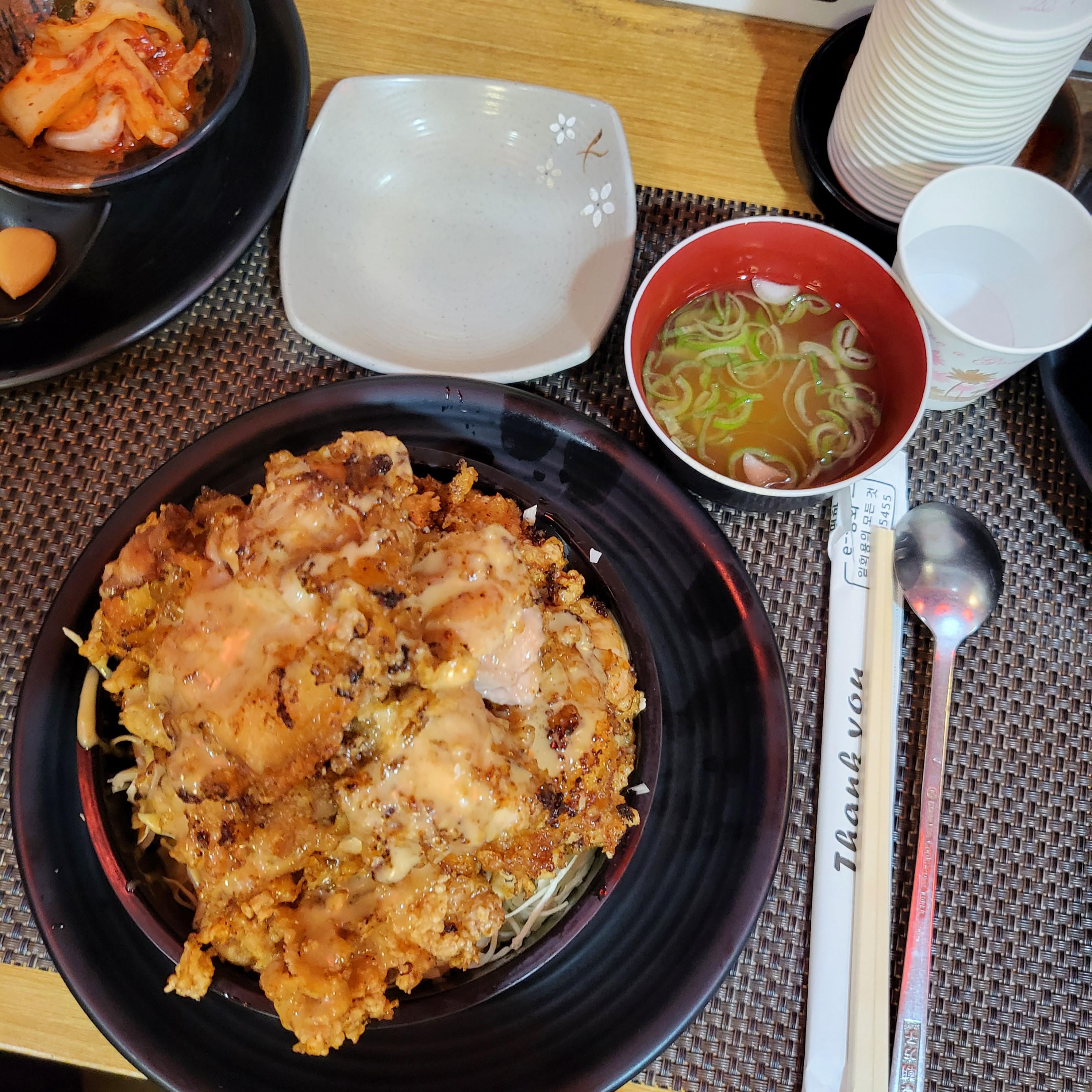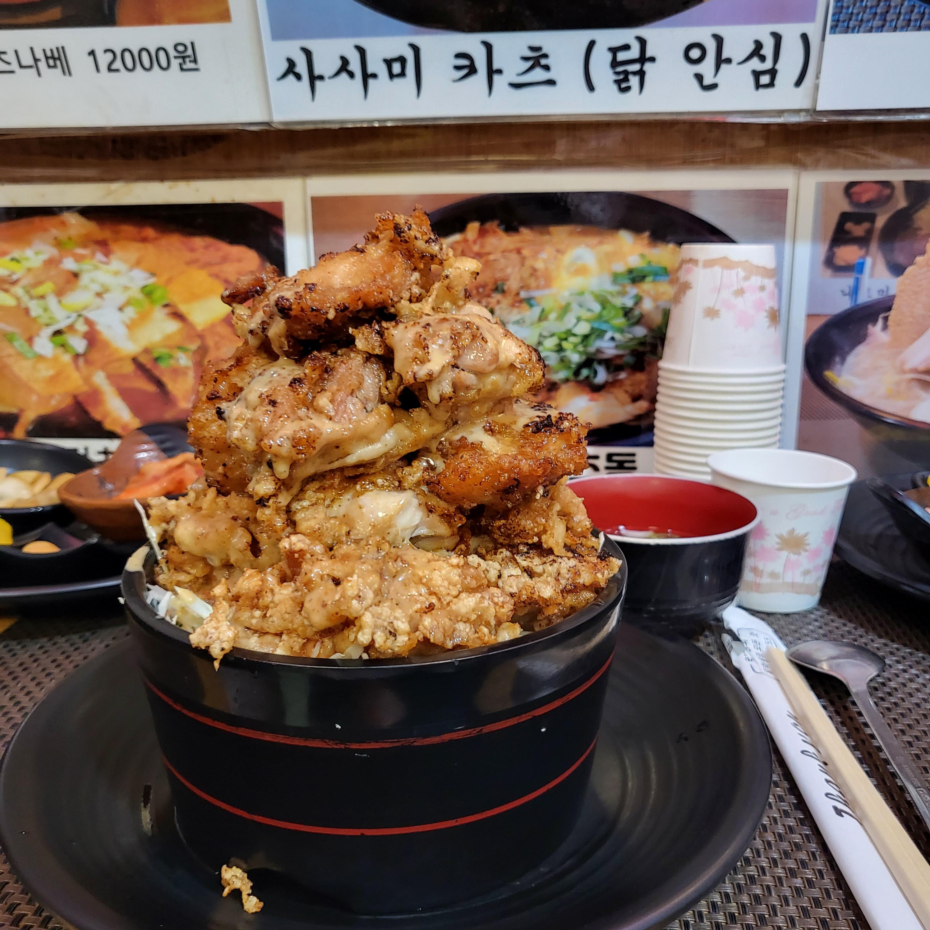 사진으로 볼때는 생각보다 작아 보일 수 있지만, 성인 남성 혼자서 먹기에도 상당히 배부를 정도로 치킨 가라아게를 밥과 양상추 위에 넘치게 쌓아주십니다. 흘릴까봐 밥그릇 밑에 큰 접시를 하나 더 놔주시더라구요ㅋㅋ