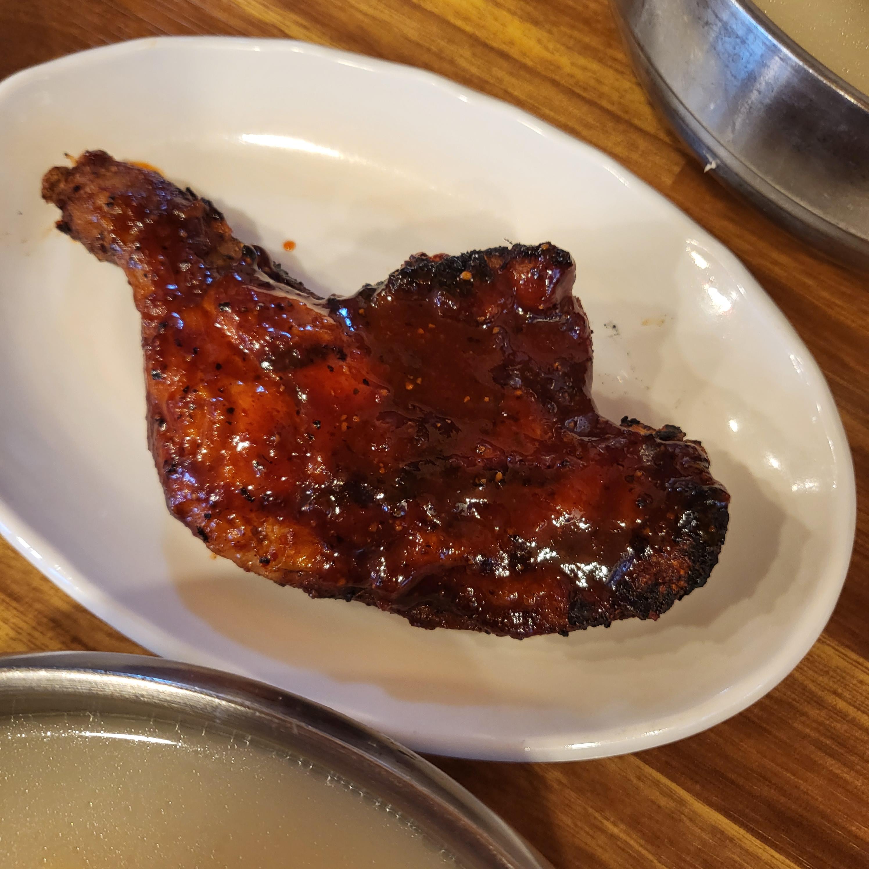 아무튼 좀 기다리보니 메뉴가 나와서 먹어봤습니다ㅎㅎ 닭다리는 매운맛으로 선택했어요. 절망 매콤하더라구요. 옛날에 먹던 매운 닭꼬치 소스 맛이랄까... (매운거 잘 못드시는분은 좀 매워하실거 같아요)