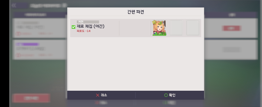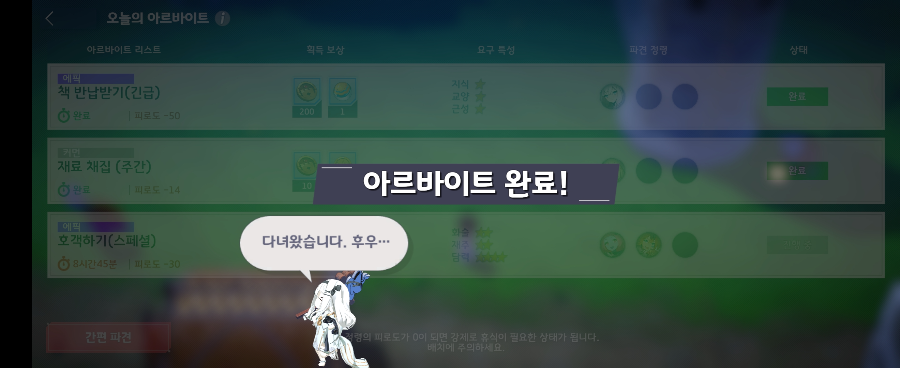 그리고, "아르바이트"라는 컨텐츠도 있는데, 캐릭터를 파견하여 일정 시간 뒤에 보상을 받을 수 있어요. 피로도가 있어서 아르바이트를 몇번하면 휴식도 취해줘야 합니다.