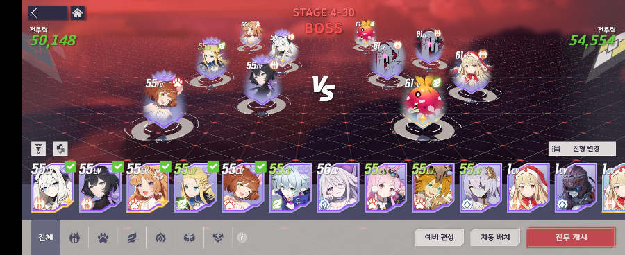 원하는 포지션에 캐릭터를 배치하고, 전투를 시작하면 알아서 싸우는 방식의 전투였습니다.