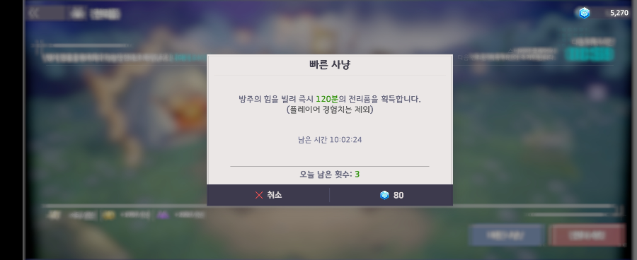 "빠른사냥" 이라는것도 있어서 120분 동안 벌 수 있는 재화를 한번에 획득할 수 있는 기능입니다. 처음에는 무료고 그 다음부터는 유료 재화가 필요했어요. 사용하면 할 수도록 소모되는 재화가 커집니다.