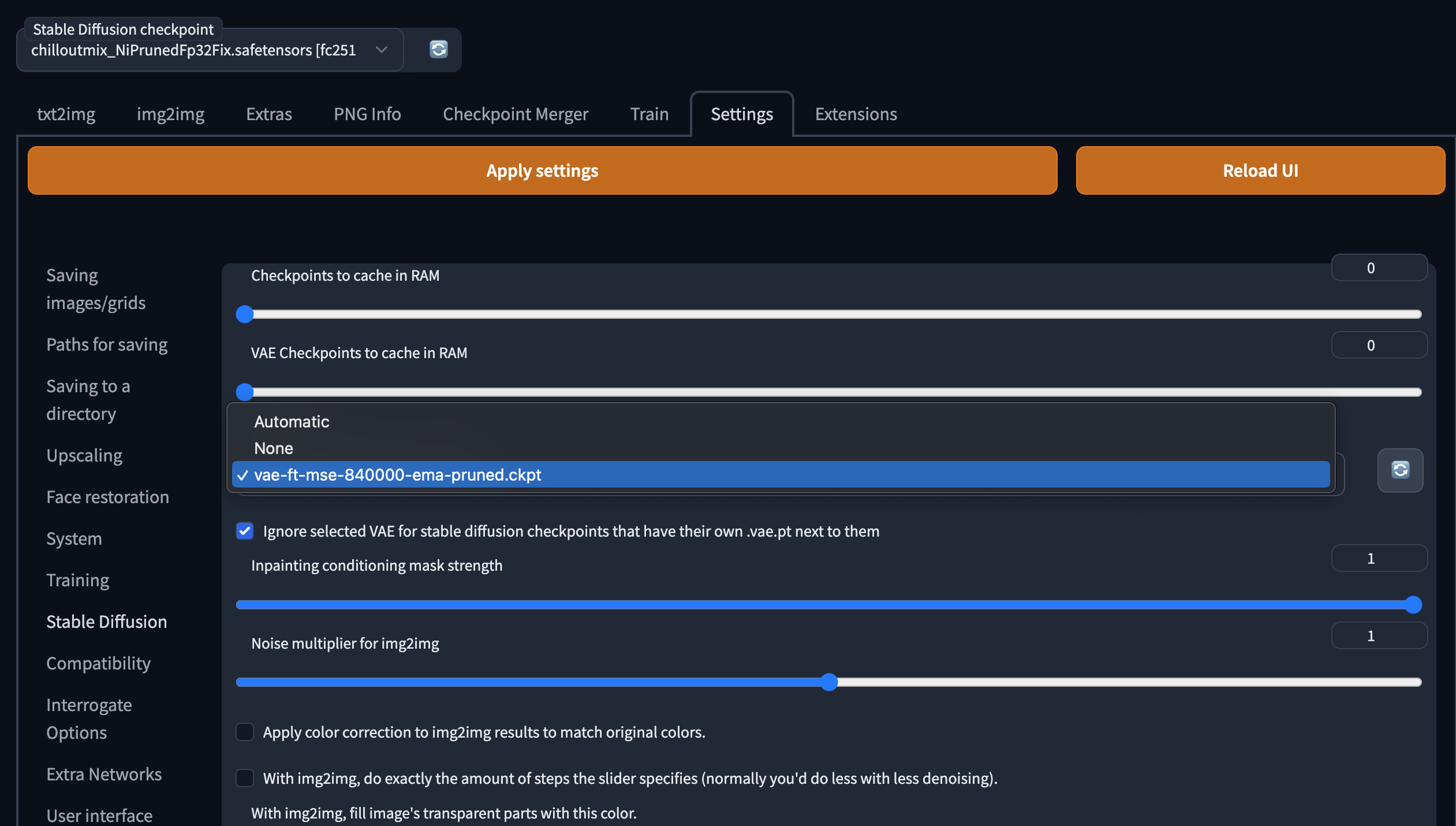 Settings 탭 > Stable Diffusion에서 SD VAE를 "vae-ft-mse-840000-ema-pruned.ckpt"를 선택한 뒤에 Apply settings 버튼을 눌러서 설정값을 저장한다.