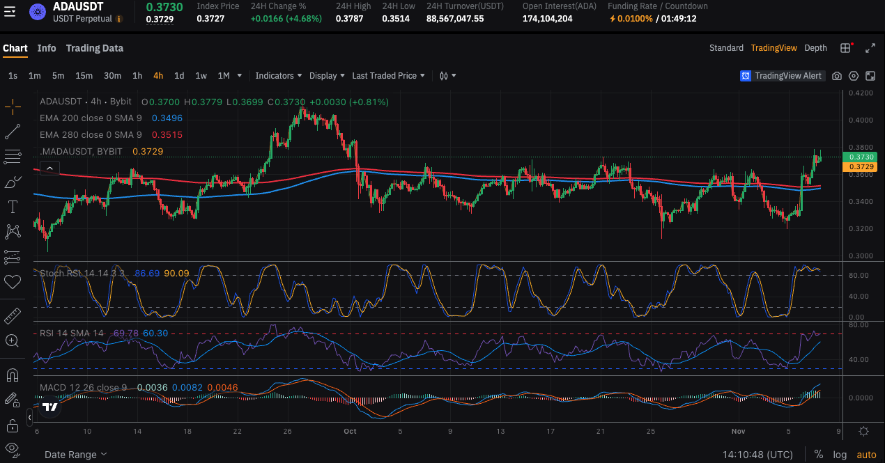 차트를 보면 가격이 EMA 200 (0.3496)과 EMA 280 (0.3515)을 강하게 돌파하며 안정적으로 이 위에 위치하고 있습니다. 이러한 돌파는 상승 모멘텀이 강하다는 신호로, EMA 200과 280이 현재 지지선 역할을 해주고 있습니다. 상승세가 지속된다면, 단기적으로 추가 상승 가능성을 기대해 볼 수 있습니다.