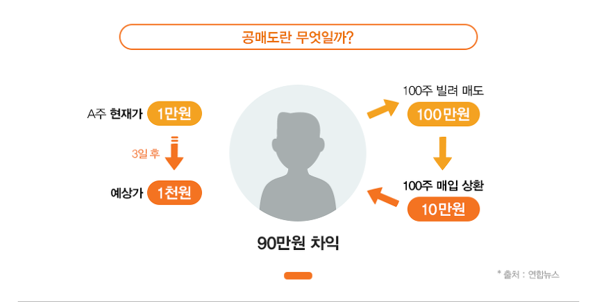 공매도는 아직 보유하지 않은 주식을 빌려서 먼저 매도한 뒤, 주가가 떨어지면 더 낮은 가격에 매수하여 차익을 얻는 거래 방식입니다.